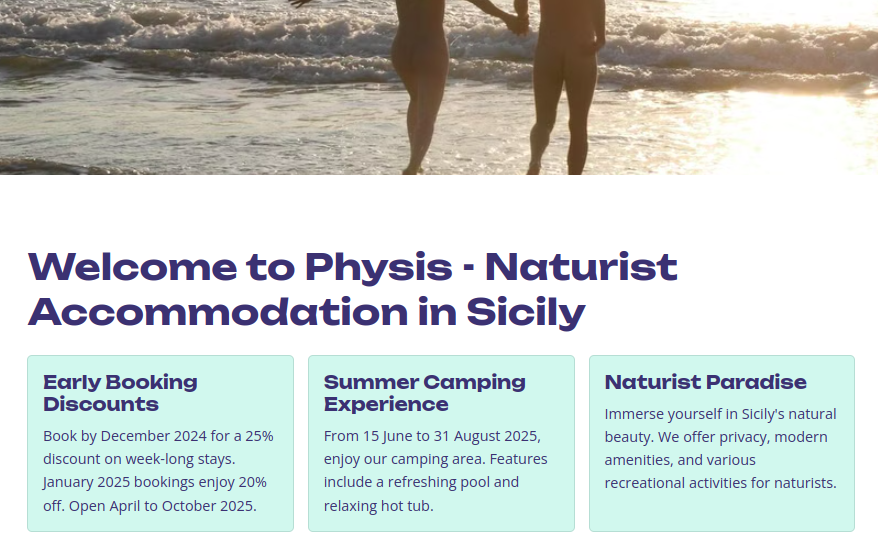 Book Now and Secure the Best Stay at the Best Price! Visit our website, learn more about Physis, and book your stay. Let yourself be enveloped by the magic of Sicilian naturism and turn your vacation in the nude into an unforgettable memory.