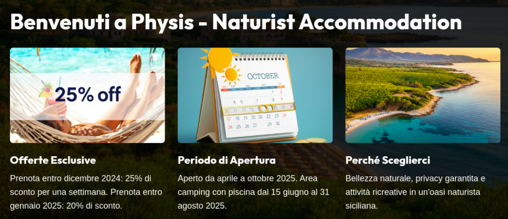 Prenota Ora e Assicurati il Miglior Soggiorno al Miglior Prezzo! Visita il nostro sito, scopri di più su Physis e prenota il tuo soggiorno. Lasciati avvolgere dalla magia del naturismo siciliano e trasforma le tue vacanze in un ricordo indimenticabile.